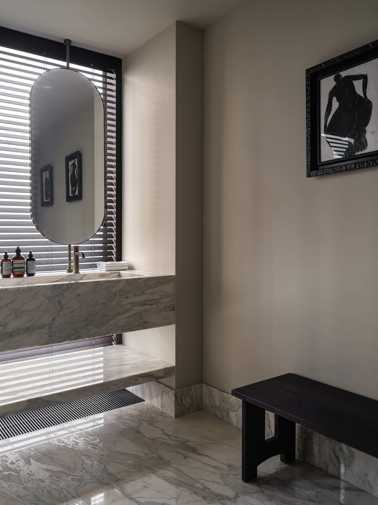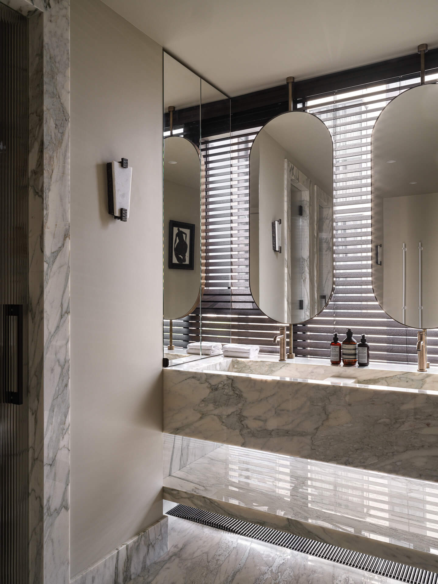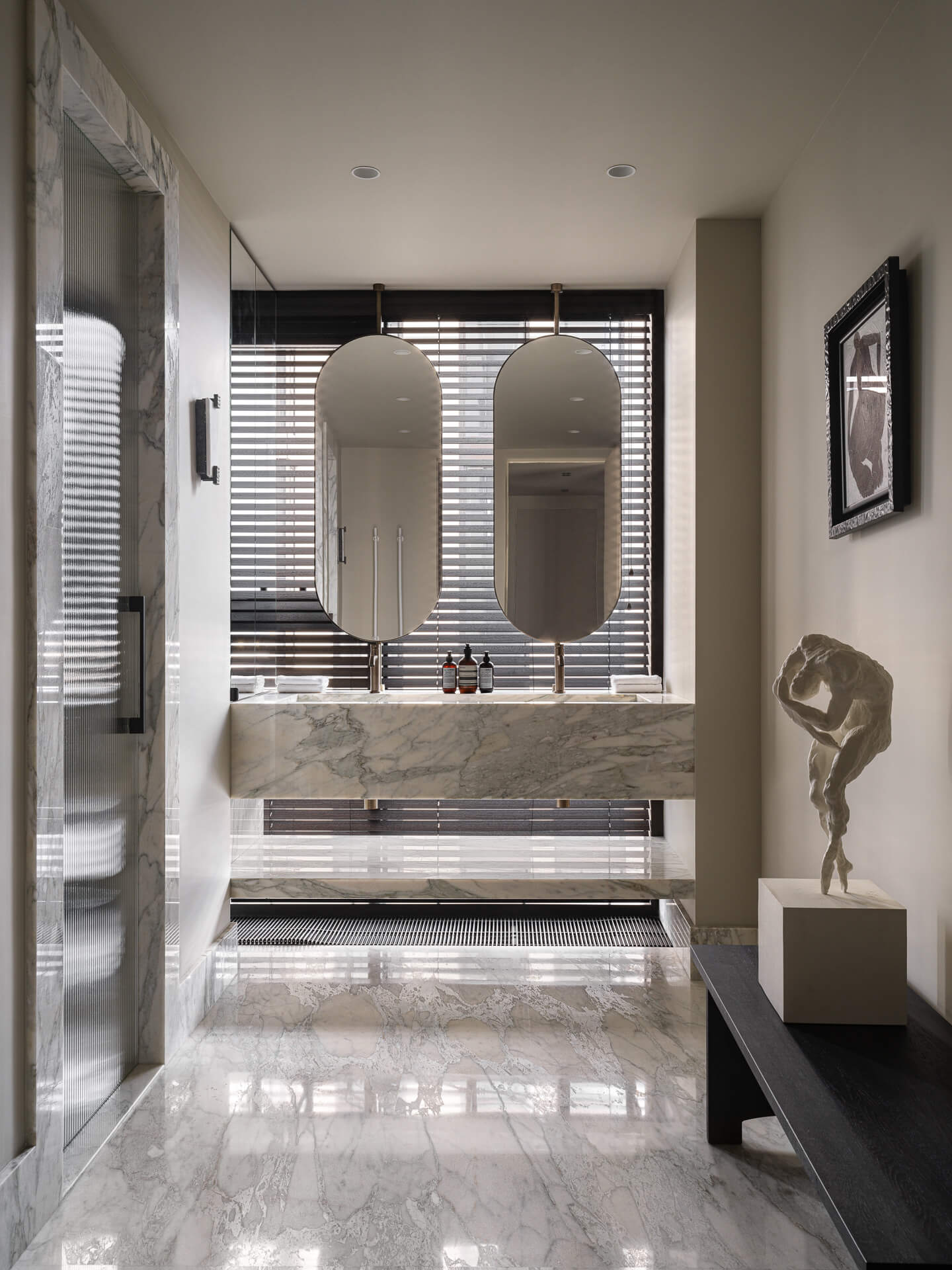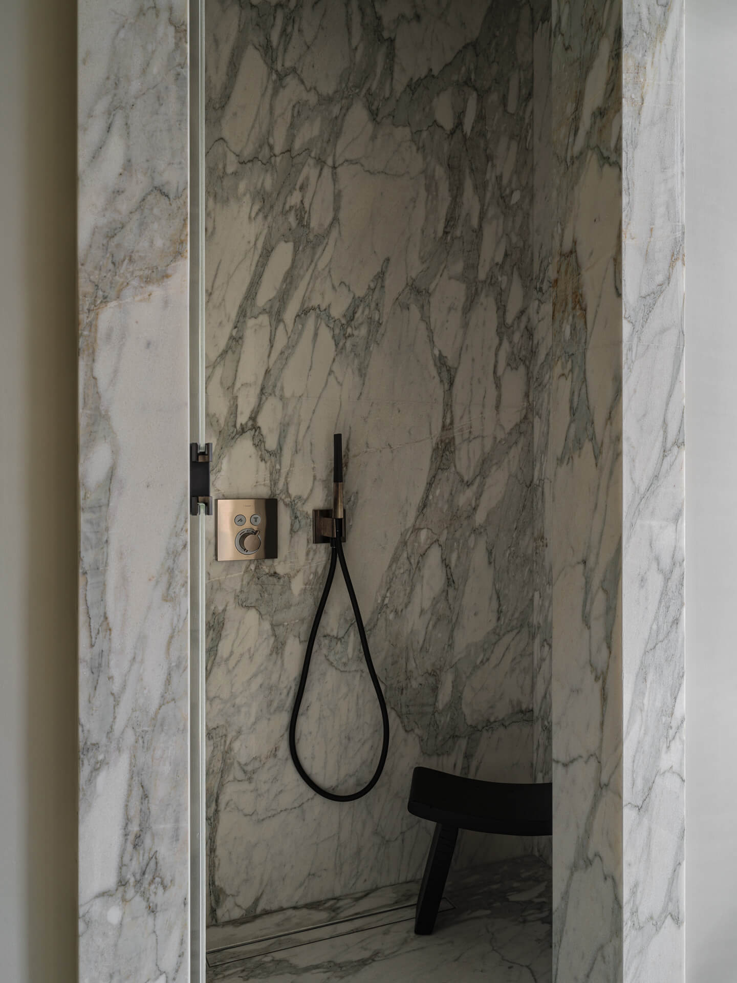 В ванной и санузле использовали керамогранит крупного формата, чтобы минимизировать количество швов. Смесители — встроенные, инсталляция — скрытая. Все коммуникации выведены в технический люк, который после монтажа визуально не заметен. Швы эпоксидные, долговечные, не темнеют.