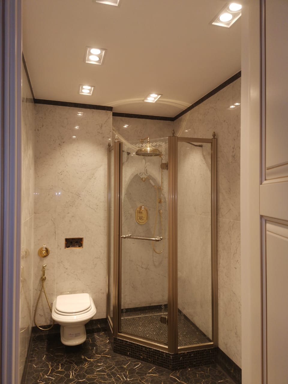 Главная особенность ремонта — многоуровневый потолок. Чтобы он выглядел аккуратно, мы сделали каркас из металлического профиля с дополнительными ребрами жёсткости. Это позволяет избежать провисаний и трещин даже через несколько лет.