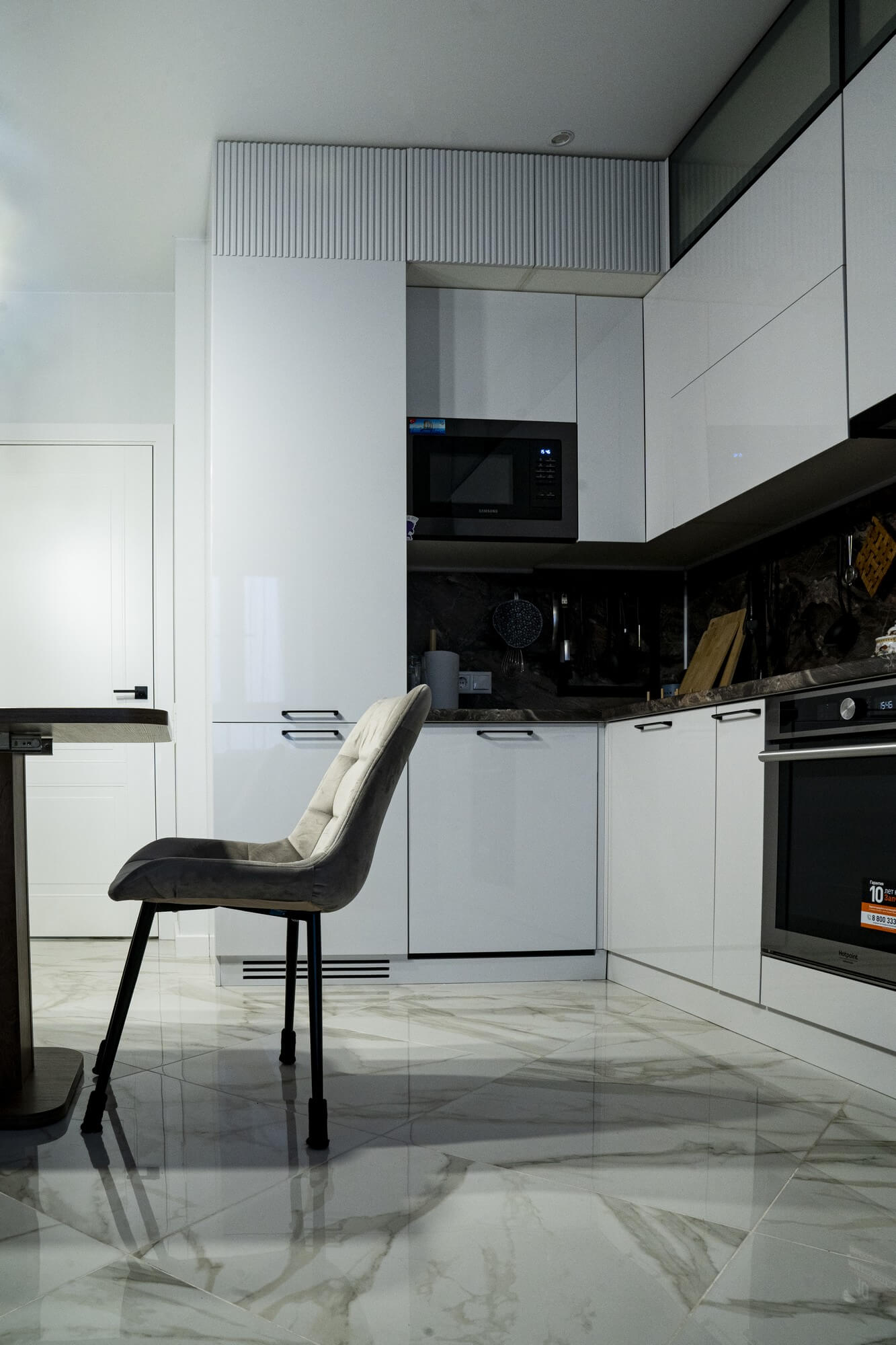 Кухня – это место, где проводит время вся семья, поэтому она должна быть не только красивой, но и максимально удобной. В данном случае мы столкнулись с небольшой площадью, поэтому эргономика стала нашим главным приоритетом. Мы спроектировали кухню так, чтобы все необходимые предметы находились под рукой, а рабочие зоны были расположены логично. Использование светлых тонов и глянцевых поверхностей визуально расширило пространство. Особое внимание уделили системе хранения: вместо обычных шкафов мы использовали выдвижные ящики и антресоли, что позволило значительно увеличить вместимость. Современная бытовая техника, встроенная в гарнитур, добавила комфорта и завершенности.
