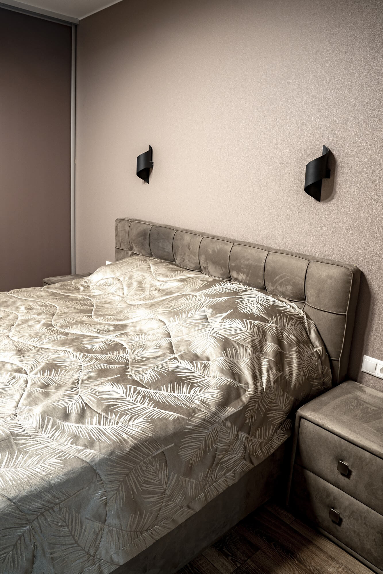 Спальня – это личное пространство, призванное дарить отдых и умиротворение. Мы стремились создать здесь атмосферу полного релакса, поэтому выбрали спокойную цветовую гамму и мягкое освещение. Использование текстиля в обивке играет ключевую роль в создании уютной атмосферы.