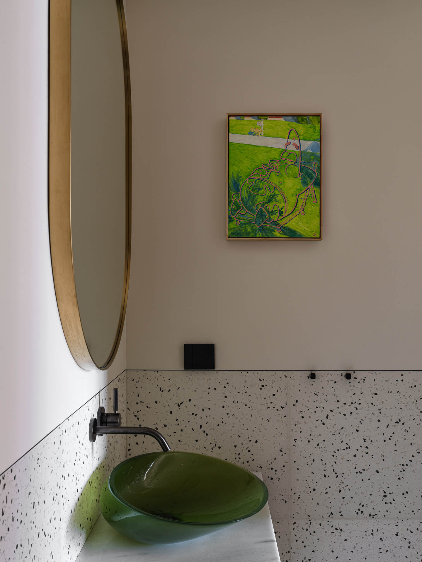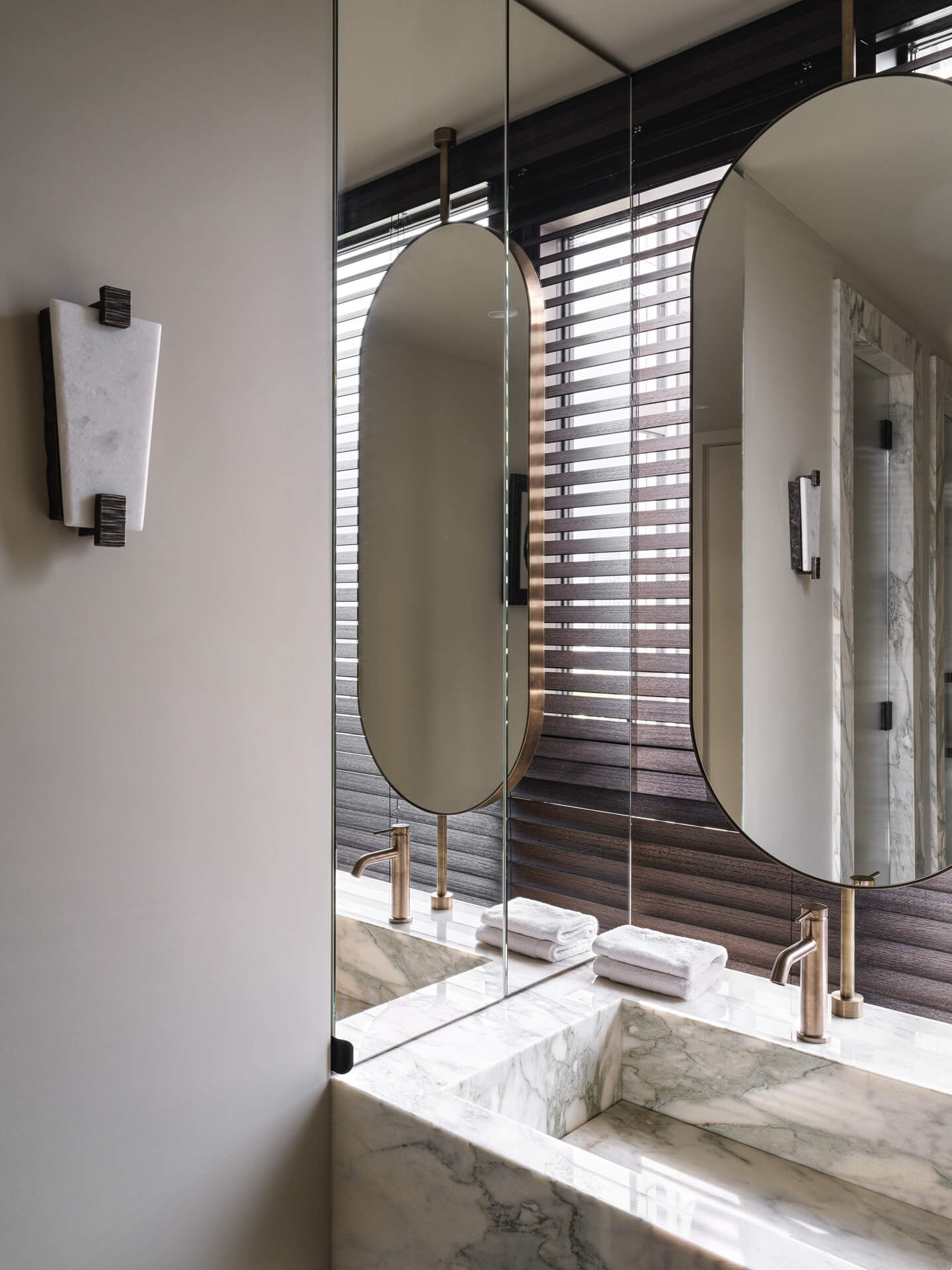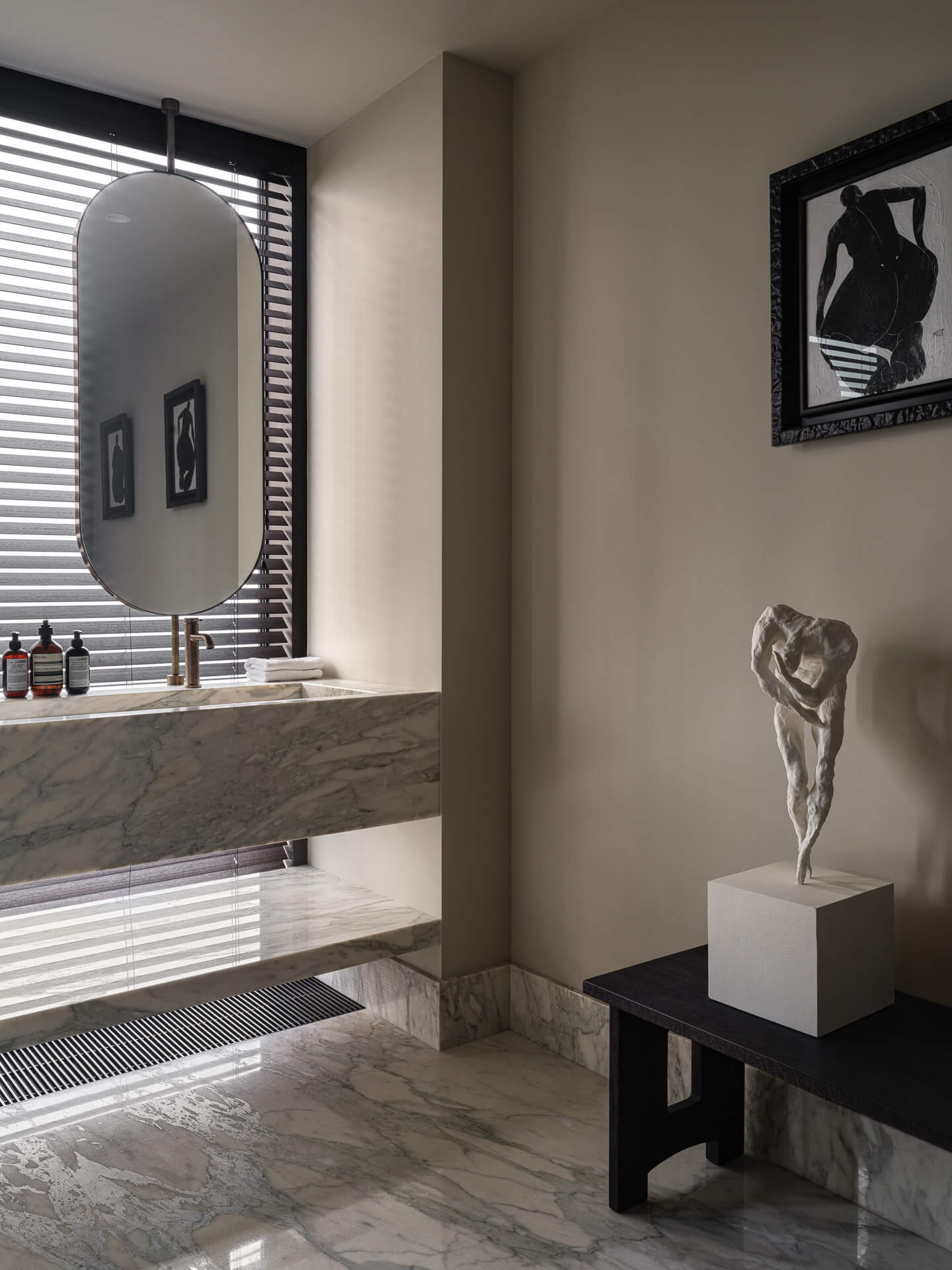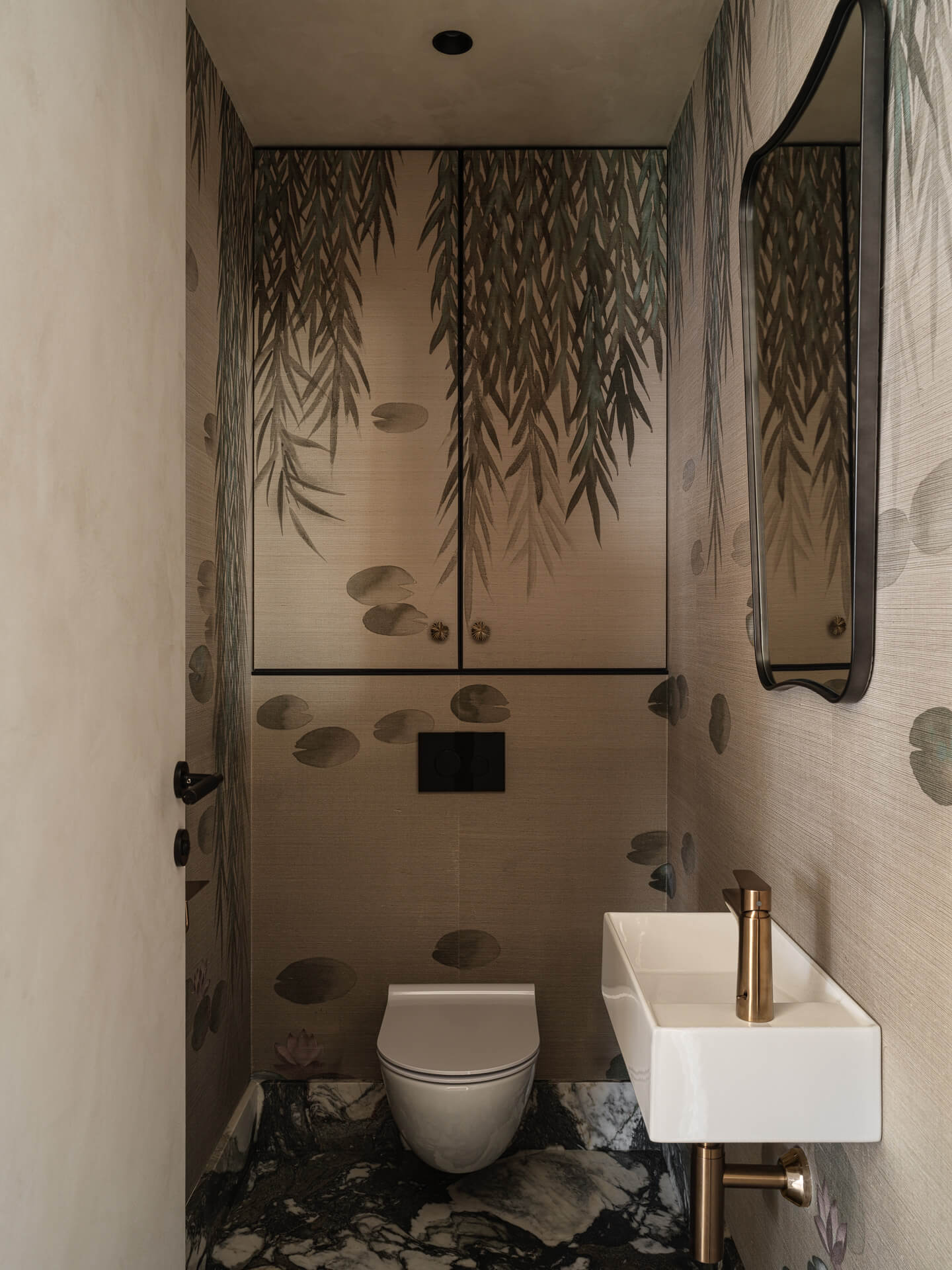 В ванной и санузле использовали керамогранит крупного формата, чтобы минимизировать количество швов. Смесители — встроенные, инсталляция — скрытая. Все коммуникации выведены в технический люк, который после монтажа визуально не заметен. Швы эпоксидные, долговечные, не темнеют.