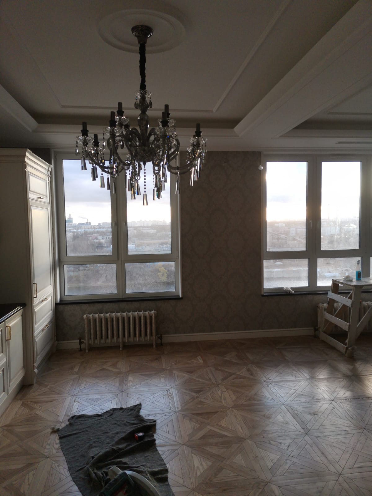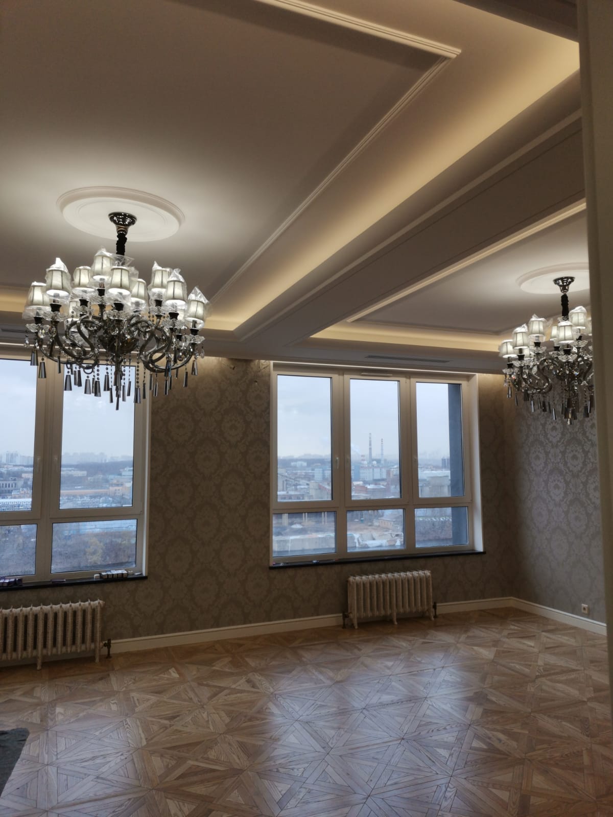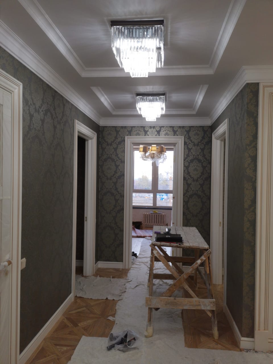 Основной задачей стали тёмные виниловые обои, качественный паркет, сложный потолок и крупные люстры — именно такие элементы хотели видеть хозяева. Но чтобы всё это выглядело гармонично, пришлось грамотно выстроить инженерную часть, подготовить стены, усилить электрику под мощные источники света, продумать высоту потолочных конструкций и аккуратно состыковать паркет с другими покрытиями. Результат получился именно таким, как ожидали клиенты — уютным, тёплым и благородным.