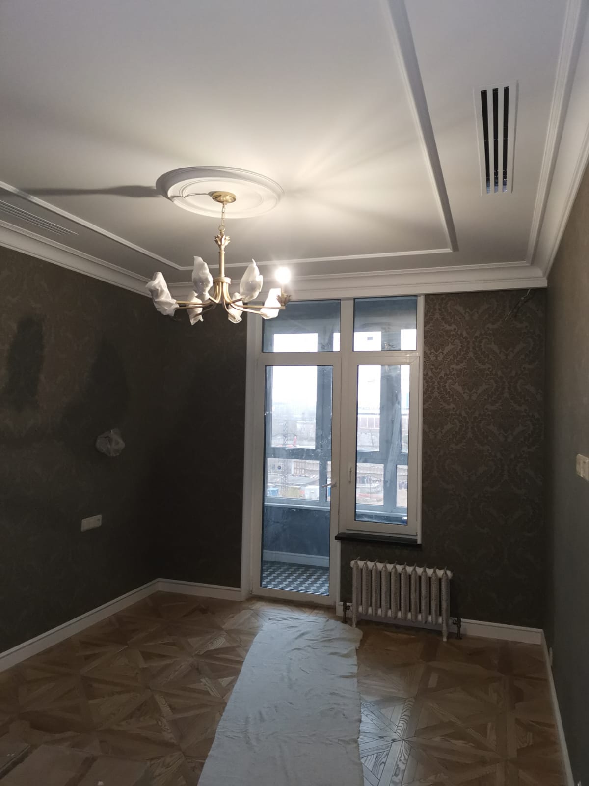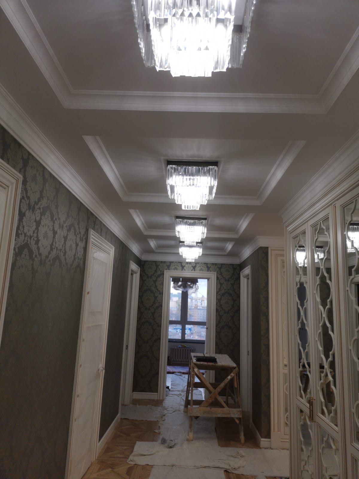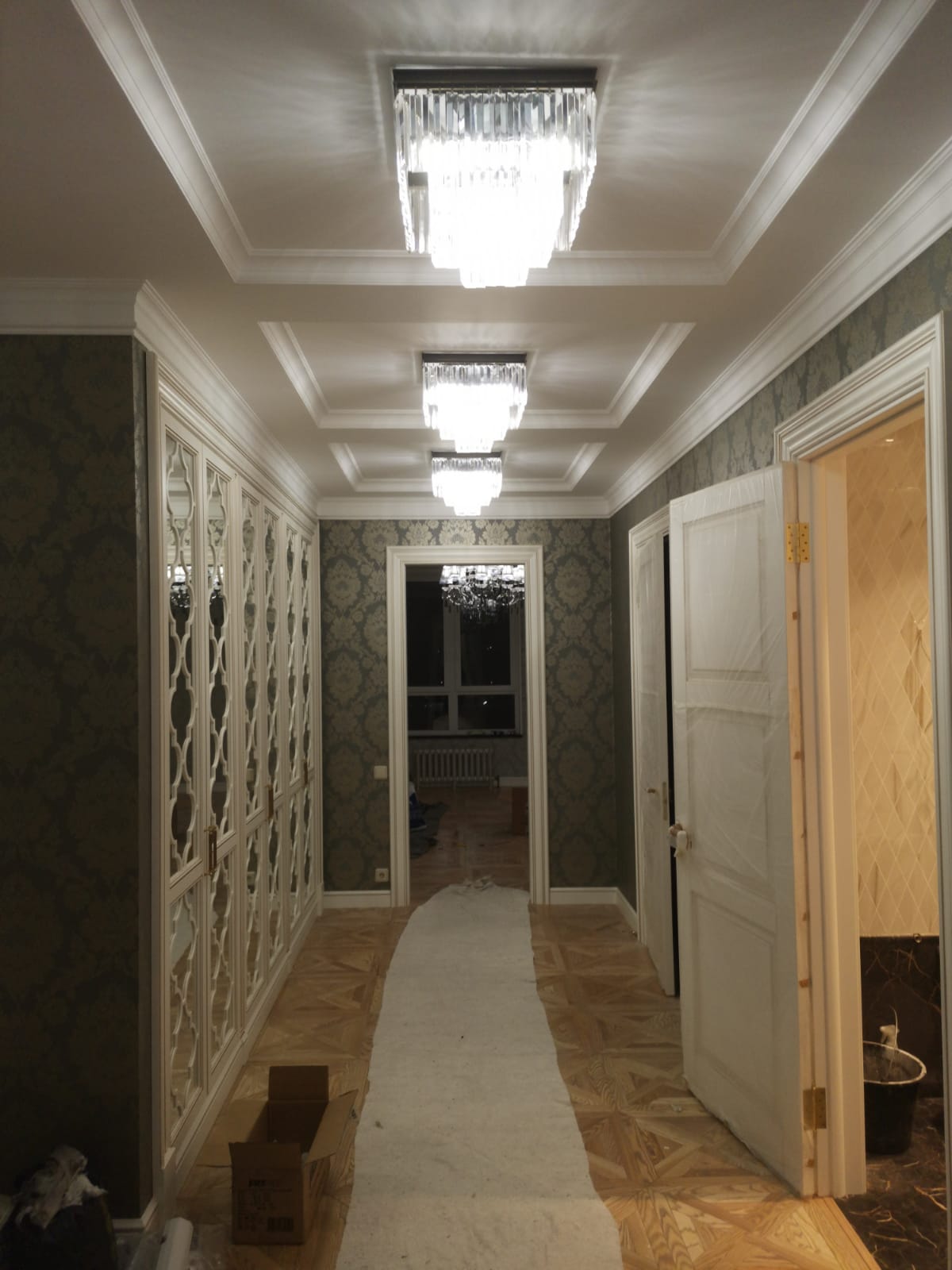 Основной задачей стали тёмные виниловые обои, качественный паркет, сложный потолок и крупные люстры — именно такие элементы хотели видеть хозяева. Но чтобы всё это выглядело гармонично, пришлось грамотно выстроить инженерную часть, подготовить стены, усилить электрику под мощные источники света, продумать высоту потолочных конструкций и аккуратно состыковать паркет с другими покрытиями. Результат получился именно таким, как ожидали клиенты — уютным, тёплым и благородным.
