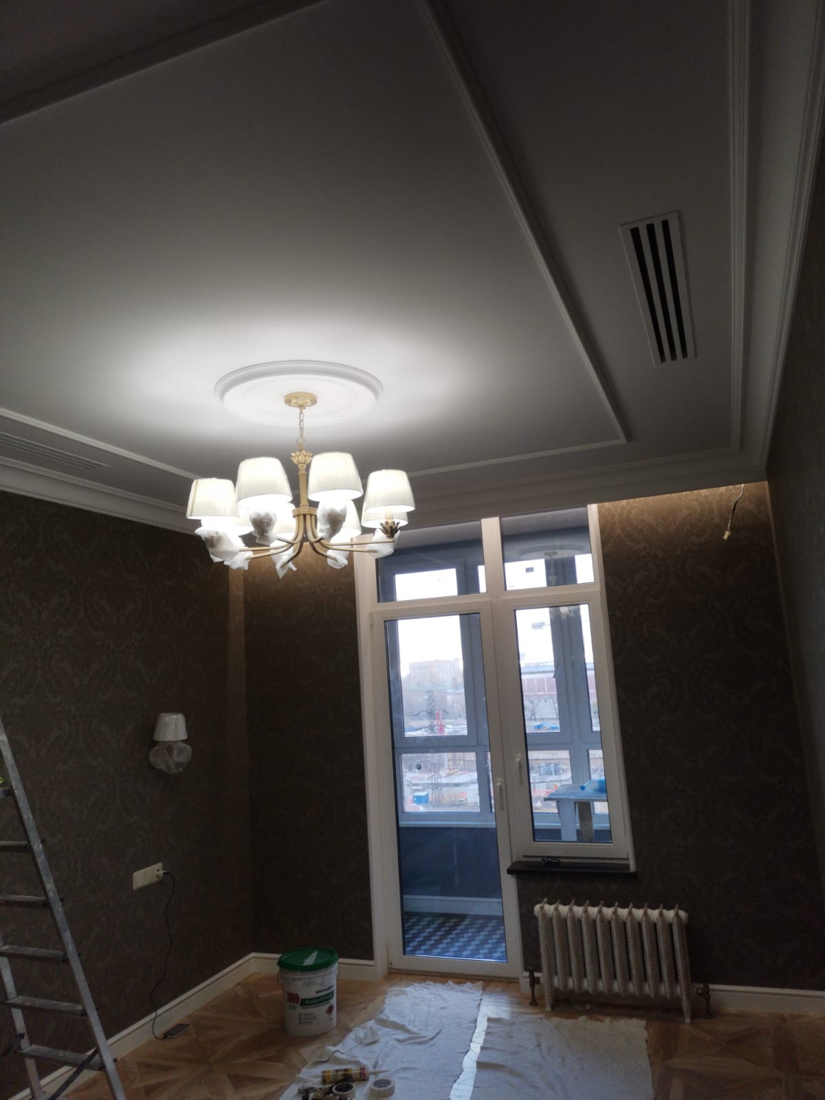 Главная особенность ремонта — многоуровневый потолок. Чтобы он выглядел аккуратно, мы сделали каркас из металлического профиля с дополнительными ребрами жёсткости. Это позволяет избежать провисаний и трещин даже через несколько лет.