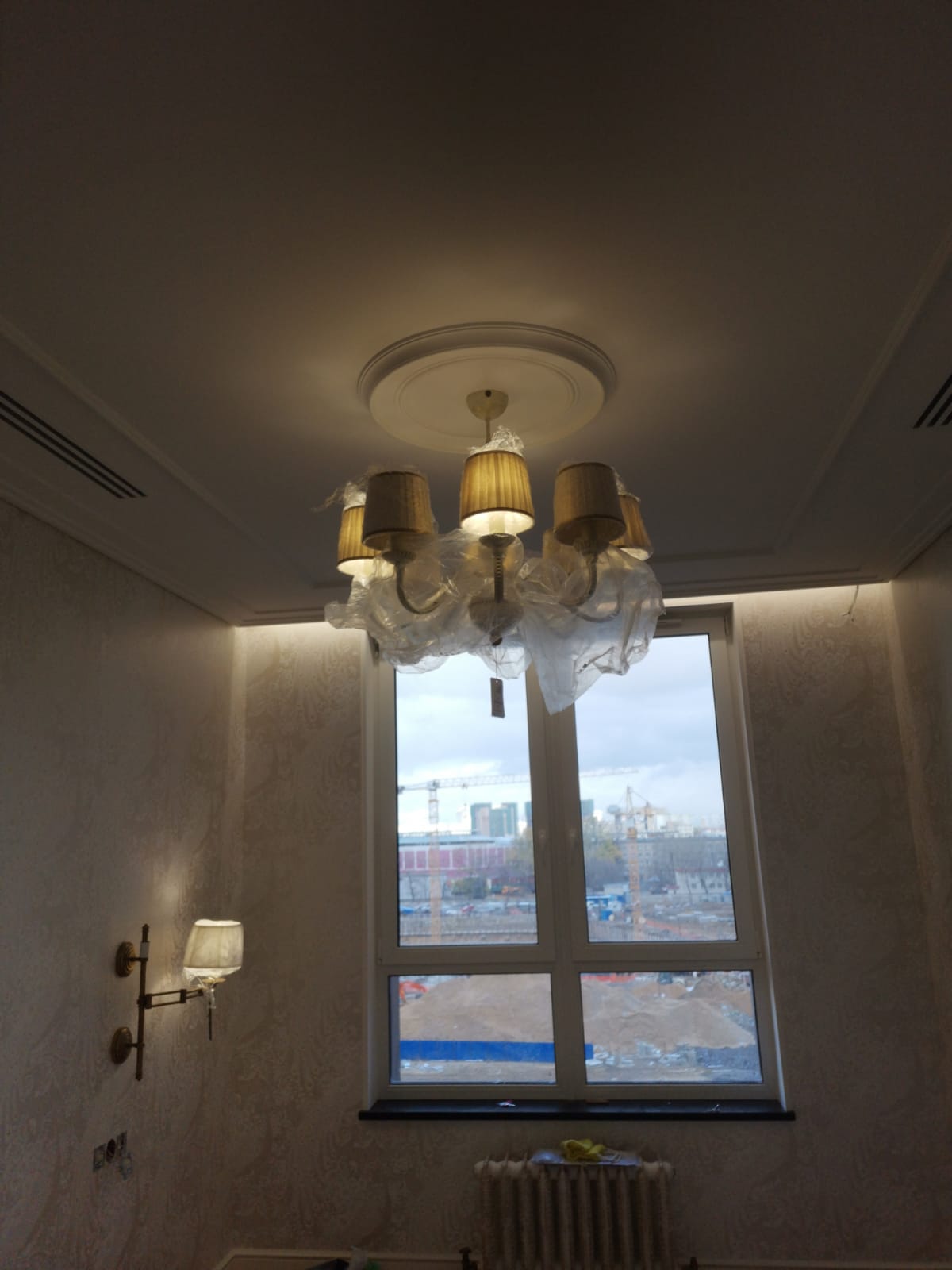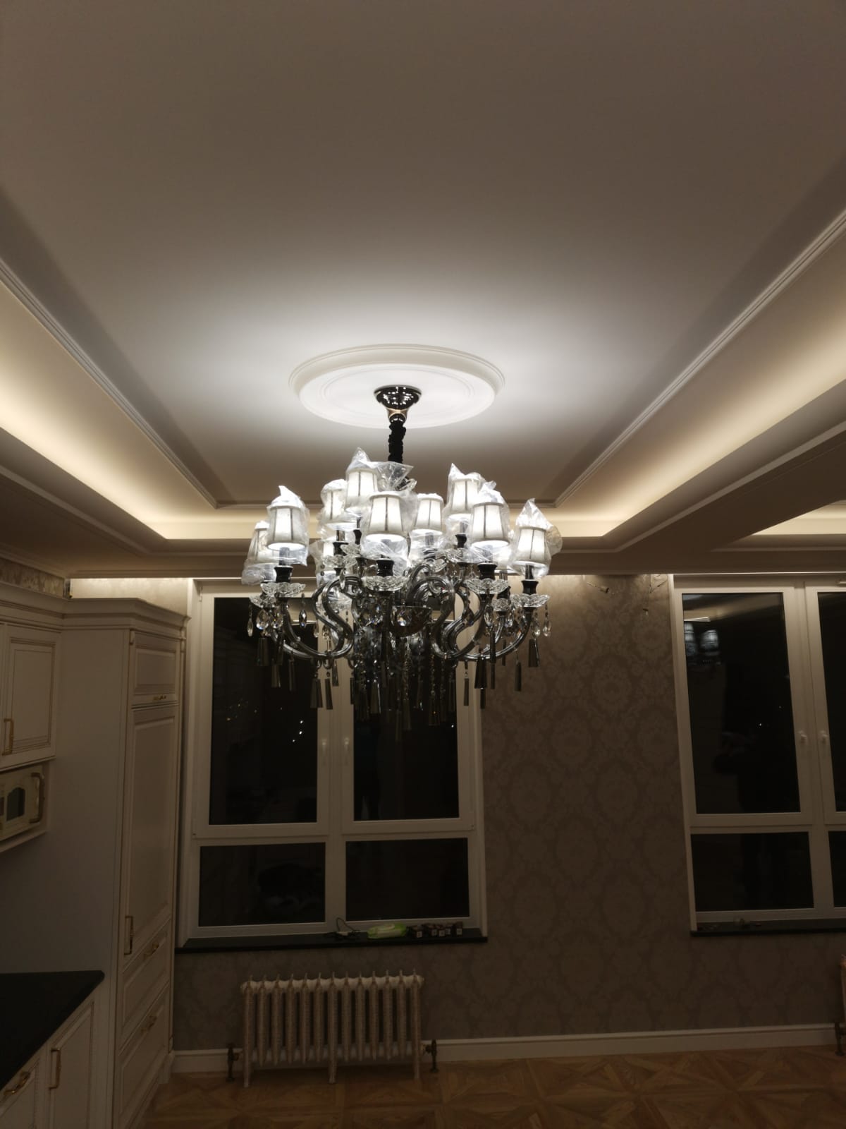 Под большие люстры требовалось усиление крепежа и отдельные линии электропитания. По статистике производителей светильников вес некоторых моделей доходит до 20–25 кг, поэтому мы использовали: